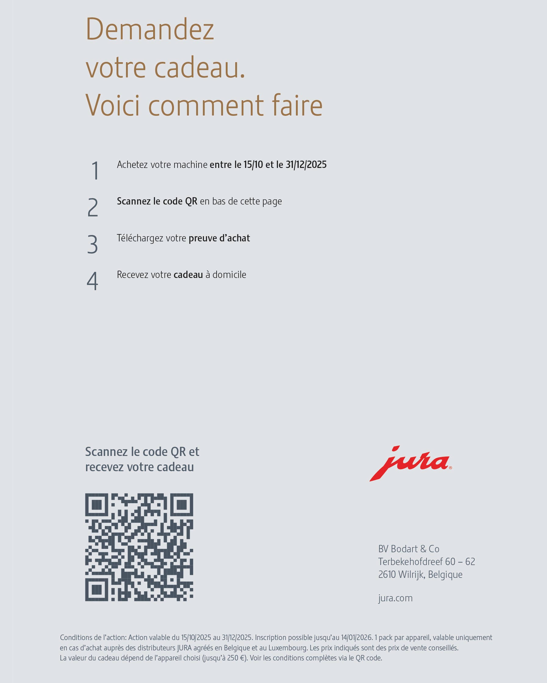 Achetez votre machine à café JURA entre le 15/10 et le 31/12/2025, et recevez un cadeau d'une valeur allant jusqu'à 250€ après enregistrement.