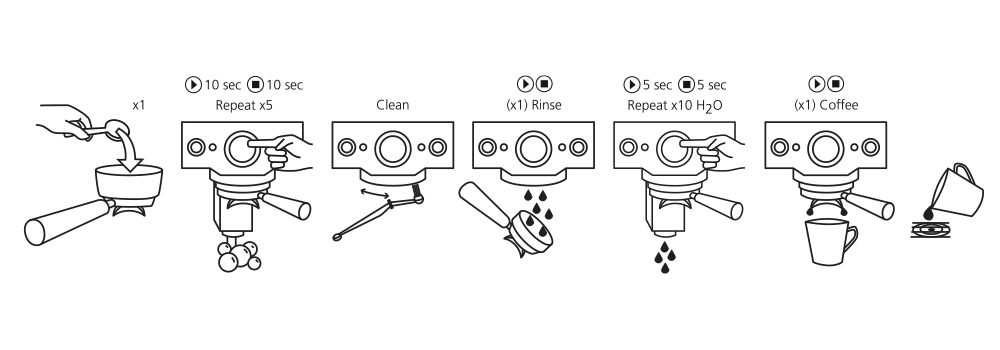 - Réinsérez la poignée avec le filtre aveugle, démarrez et arrêtez le cycle 10 fois - faites fonctionner pendant 5 secondes, arrêtez pendant 2 secondes pour assurer un rinçage complet.