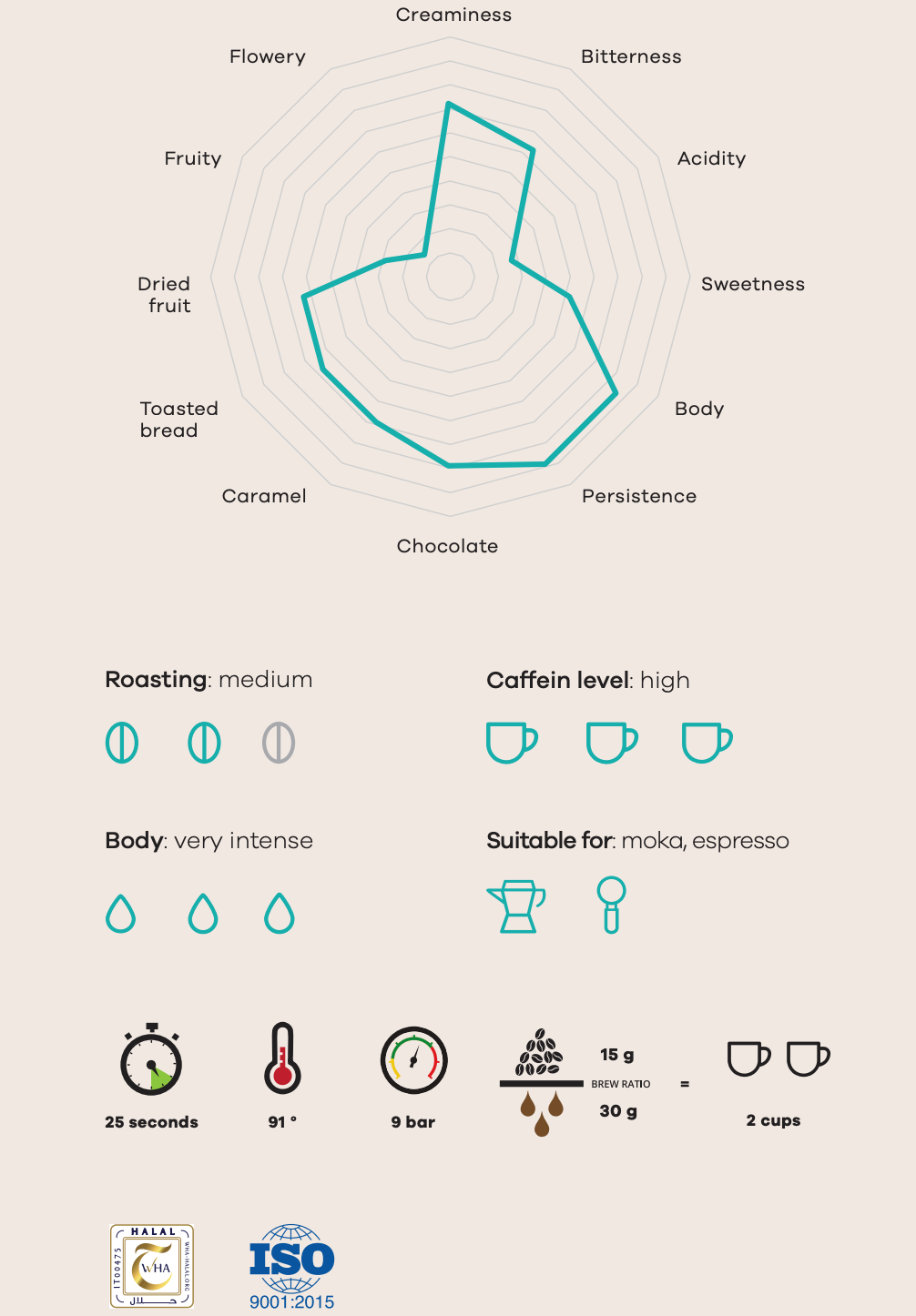 Un mélange avec une intensité, une saveur crémeuse avec des notes de chocolat et de pain grillé.