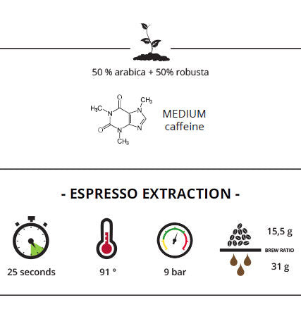 Italia est un mélange de cafés à base d’Arabica du Brésil et d’Éthiopie, et du Robusta d'Ouganda.