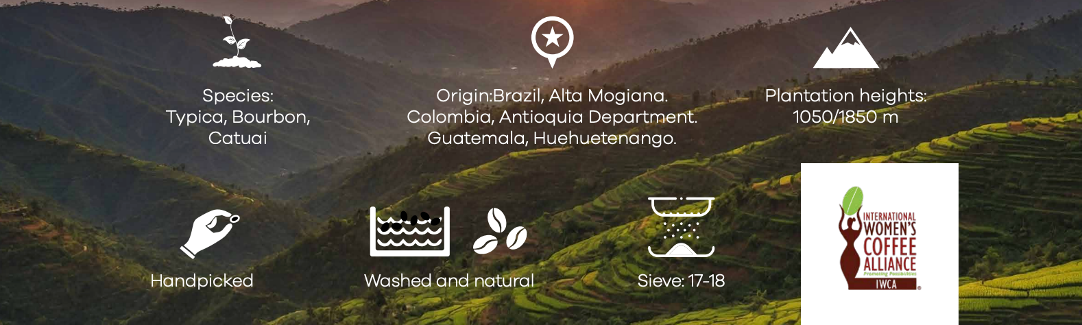 Origines: Brésil (Alta Mogiana), Colombie (Antioquia Department), Guatemala (Huehuetenango).